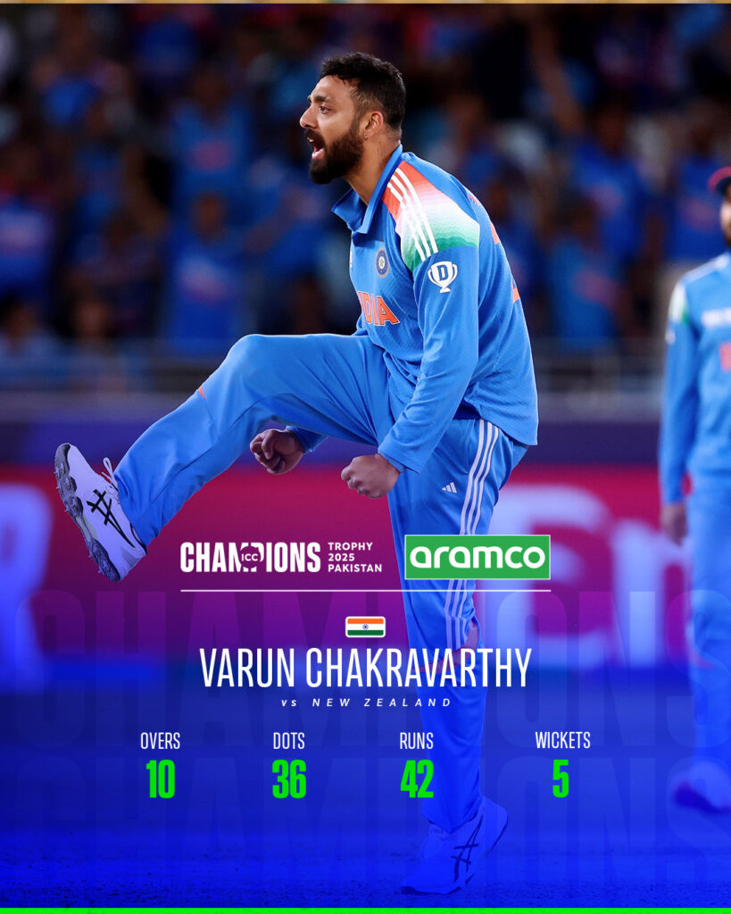चैंपियंस ट्रॉफी 2025 के ग्रुप स्टेज के आखिरी मुकाबले में वरुण चक्रवर्ती की शानदार फिरकी गेंदबाजों की बदौलत भारत ने न्यूजीलैंड को 44 रनों से हरा दिया. अपने डेब्यू मैच में मैच के बेस्ट खिलाड़ी का खिताब हासिल करने वाले वरुण ने 10 ओवरों के अपने स्पेल में 42 रन देकर न्यूजीलैंड के 5 बल्लेबाजों को पैवेलियन में वापस भेजा. न्यूजीलैंड ने टॉस जीतकर पहले गेंदबाजी चुनी.
